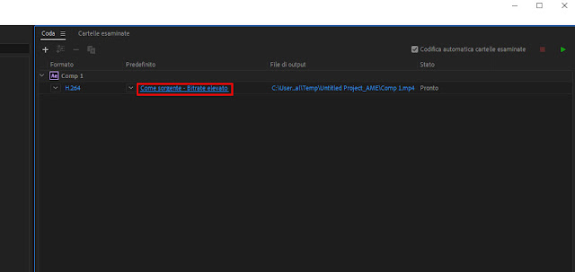 Verrà aperto automaticamente Media Encoder e dovremo impostare i parametri per l'esportazione. Selezioniamo il codec h264 per ottenere un file.mp4.